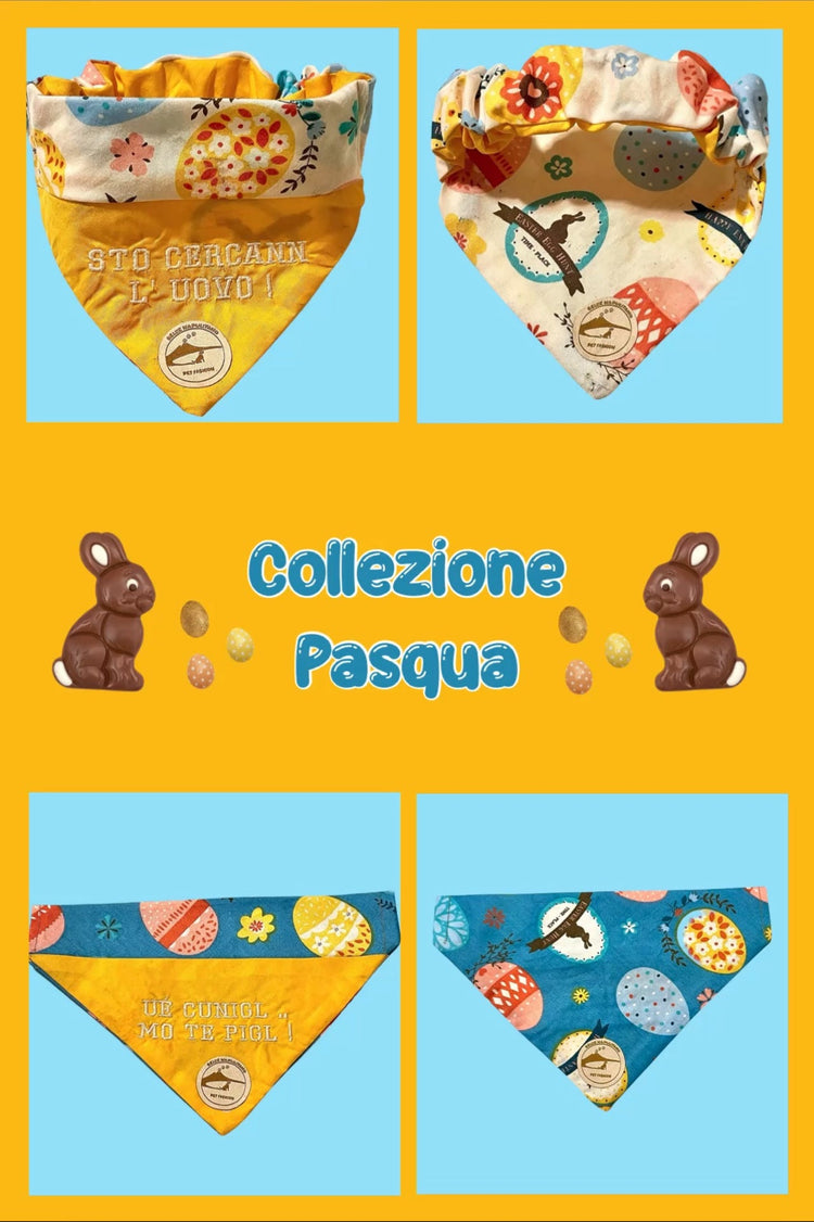 Celebra la Pasqua con un tocco di allegria partenopea! Ti presentiamo la nostra Collezione sartoriale di bandane double-face per cani, unica ed esclusiva. Un accessorio perfetto per il tuo amico a quattro zampe, combinando tradizione, umorismo e alta qualità.