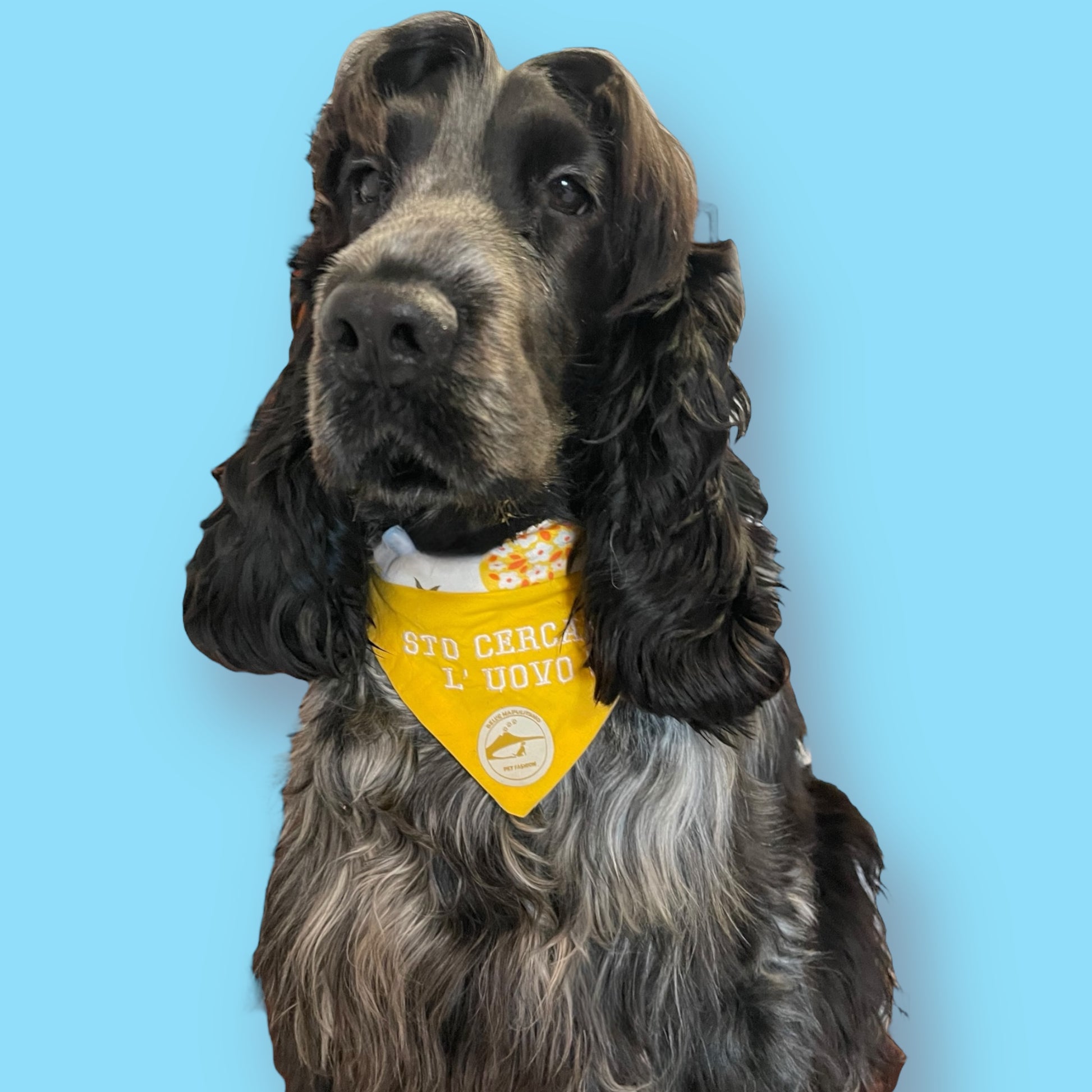 Bandane cane Pasqua sartoriale double-face. Frase ricamata in Napoletano & Puro cotone " STO CERCANN L'UOVO” a COLLARE