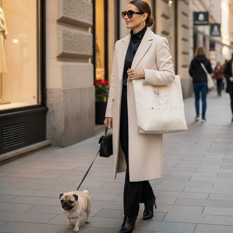 Porta con te la simpatia travolgente del tuo Carlino ovunque tu vada. La nostra Tote Bag con Carlino" in edizione limitata unisce la praticità di una borsa quotidiana alla bellezza di un'opera d'arte contemporanea. Il design in line art ritrae il profilo iconico del Carlino che si fonde in un cuore, creando un simbolo d'amore unico e ricercato.