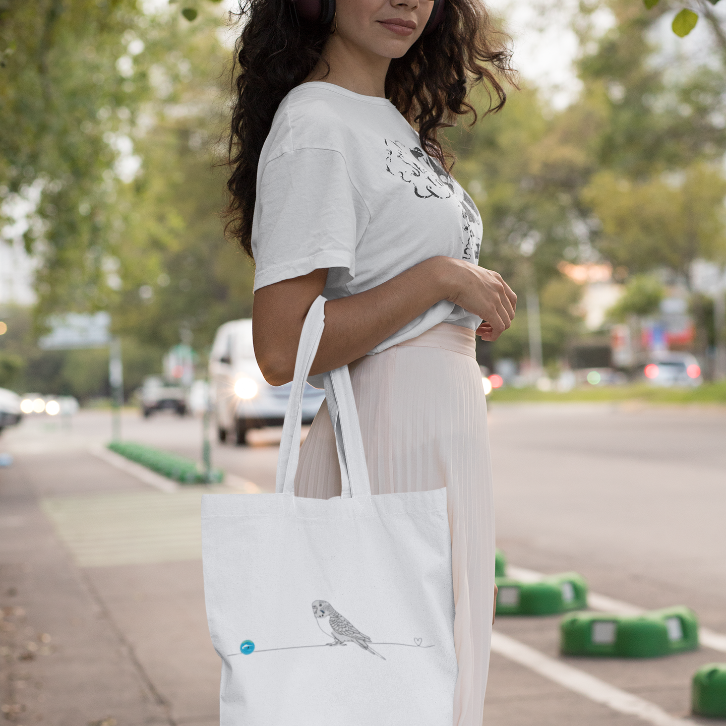 Un pappagallino non è solo un animale domestico: è un concentrato di curiosità, colore e vita che riempie ogni stanza con la sua presenza vibrante. La nostra borsa Line Art "Skylark Soul" cattura questa energia in un disegno essenziale, dove una singola linea danza sul tessuto per dare vita al profilo elegante del tuo piccolo compagno.
