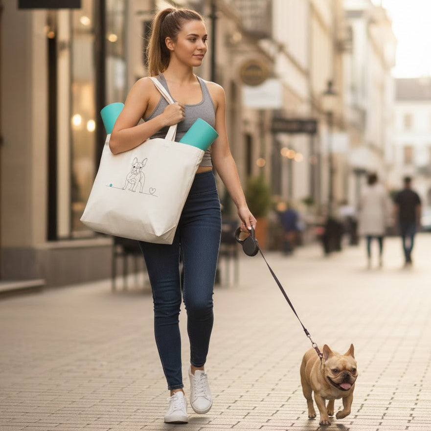 Porta con te l'eleganza ovunque tu vada. La nostra esclusiva Tote Bag in Edizione Limitata non è solo una borsa, ma una dichiarazione d'amore per il Bulldog Francese. Caratterizzata da un raffinato design Line Art, questa borsa presenta un tratto continuo e moderno che disegna il profilo iconico del Frenchie impreziosito da un delicato cuore.