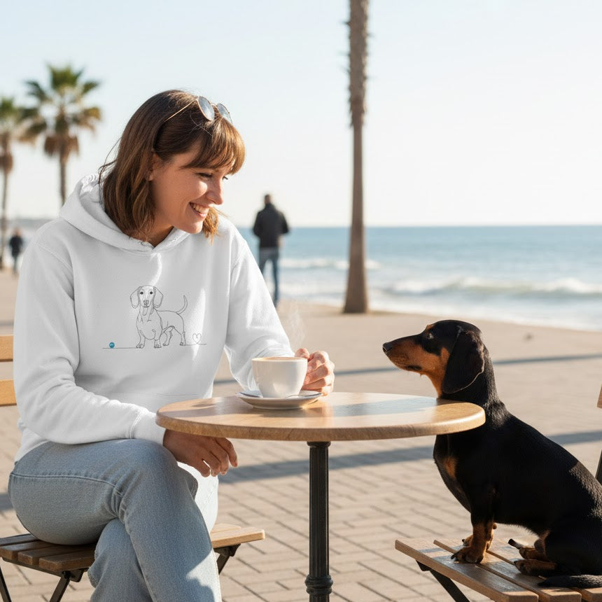 Porta il tuo amore per i bassotti sempre con te. Questa felpa esclusiva non è solo un capo d'abbigliamento, ma una dichiarazione d'affetto. Caratterizzata da un raffinato design minimalista in stile line art, ritrae l'iconica silhouette del bassotto impreziosita da un piccolo cuore, simbolo del legame indissolubile con il tuo amico a quattro zampe.