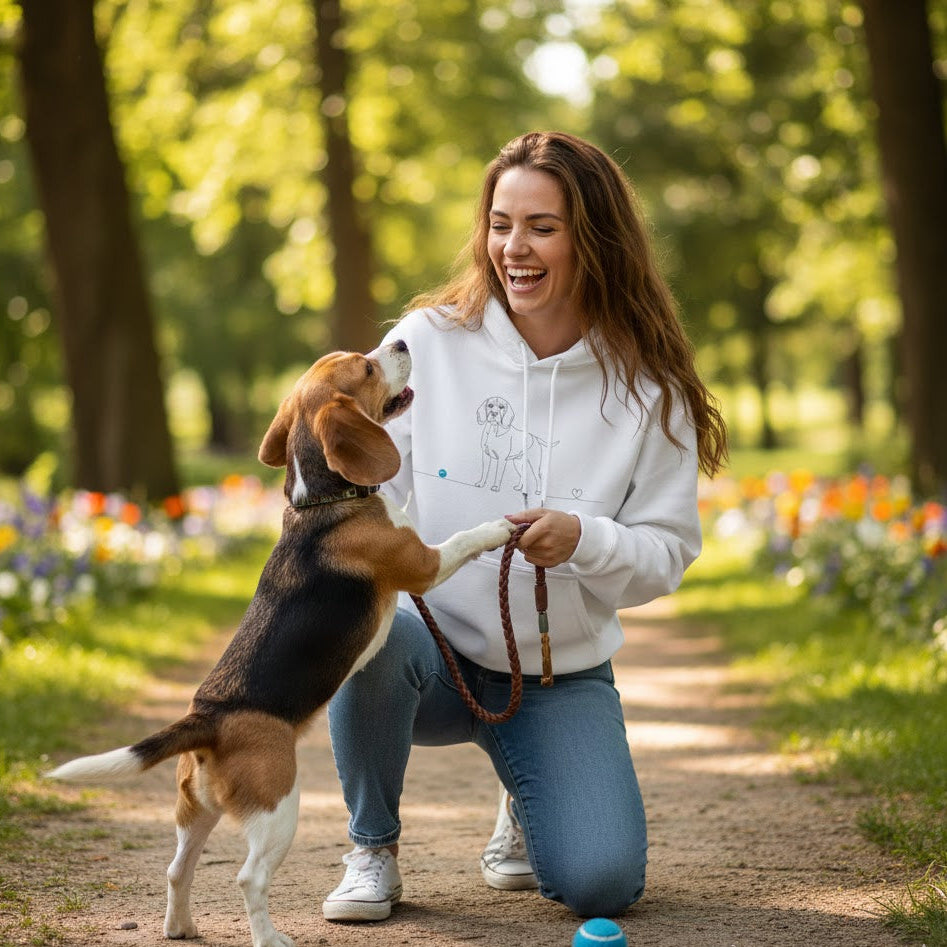 Porta sempre con te l'eleganza vivace del tuo amico a quattro zampe. Questa felpa esclusiva combina un design minimalista Line Art con il massimo del comfort, rendendola il capo essenziale per ogni proprietario di Beagle che non vuole rinunciare allo stile.