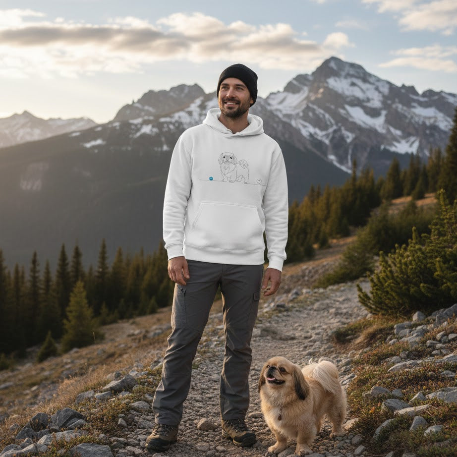 Esprimi il legame speciale con il tuo amico a quattro zampe attraverso lo stile raffinato della nostra felpa con cappuccio in edizione limitata. Caratterizzata da un esclusivo disegno line art, questa felpa ritrae la silhouette iconica del Pechinese che si conclude in un delicato cuore: un tocco artistico discreto ma profondo, perfetto per chi ama il design minimalista.