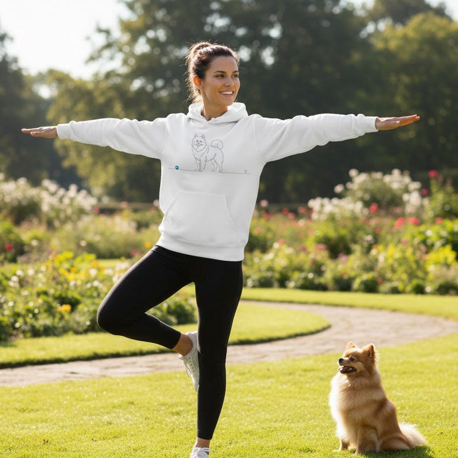 Esprimere l'amore per il tuo compagno a quattro zampe non è mai stato così elegante. La nostra esclusiva felpa con cappuccio dedicata allo Spitz di Pomerania presenta un design in line art ricercato: un tratto unico, continuo e armonioso che delinea la silhouette vivace dello Spitz, terminando in un cuore delicato.