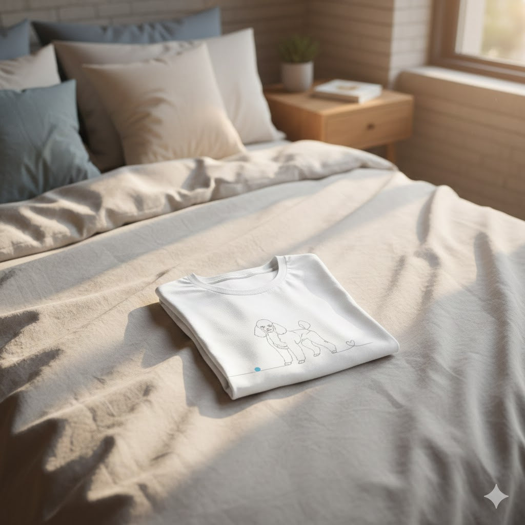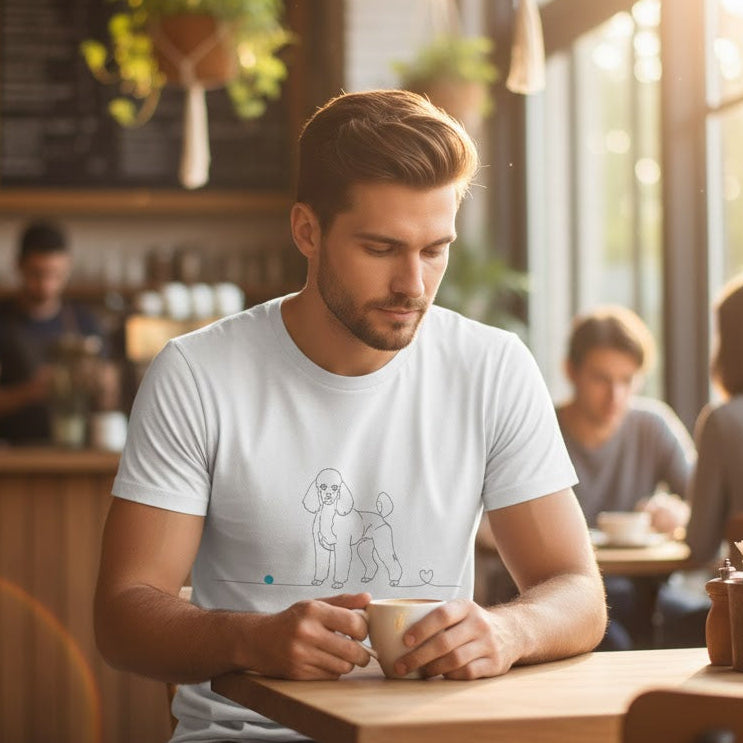 Chi possiede un Barboncino sa che non è solo un animale domestico, ma un membro della famiglia, un ombra fedele, un cuore che cammina accanto a noi. La nostra maglietta "Legame infinito" celebra questo amore puro con un design line art minimalista: una linea continua che disegna la sagoma inconfondibile del tuo compagno e termina in un piccolo cuore, proprio lì dove nasce l'affetto più sincero.