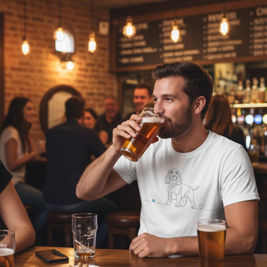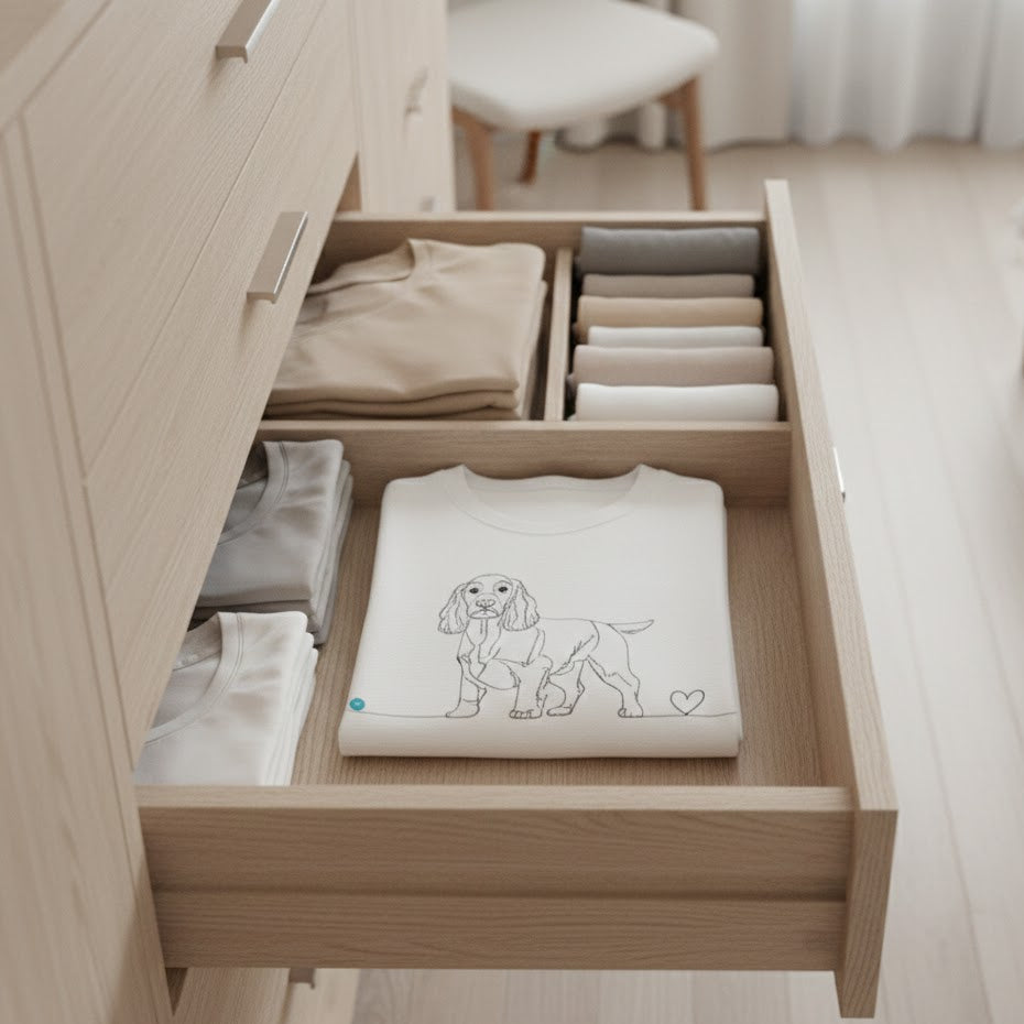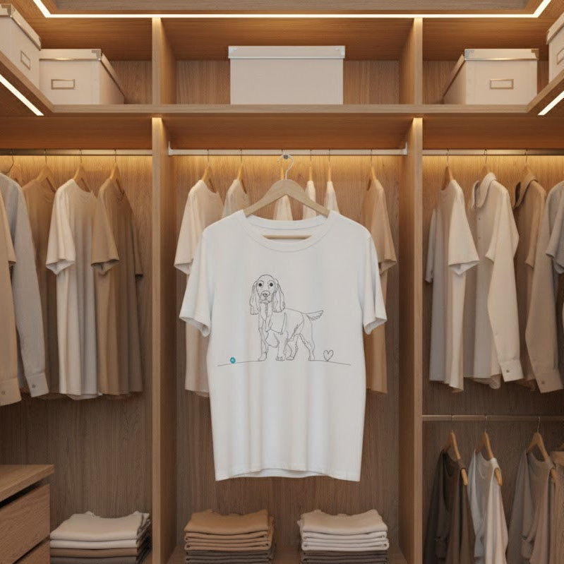 Indossa la tua passione con eleganza. La nostra T-shirt Cocker non è un semplice capo d'abbigliamento, ma una dichiarazione d'amore per il tuo fedele compagno. Il design in Line Art cattura con una linea continua e raffinata il profilo dolce del Cocker, culminando in un cuore che simboleggia un affetto infinito.