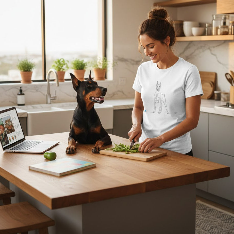 Esprimi il tuo legame profondo con una delle razze più nobili e leali al mondo. La nostra T-shirt esclusiva presenta un raffinato disegno Line Art: un tratto unico, essenziale e moderno che delinea la fiera silhouette del Dobermann, terminando in un cuore delicato. Non è solo una maglietta, ma una dichiarazione d'amore per il tuo compagno di vita, realizzata con il massimo rispetto per l'ambiente.