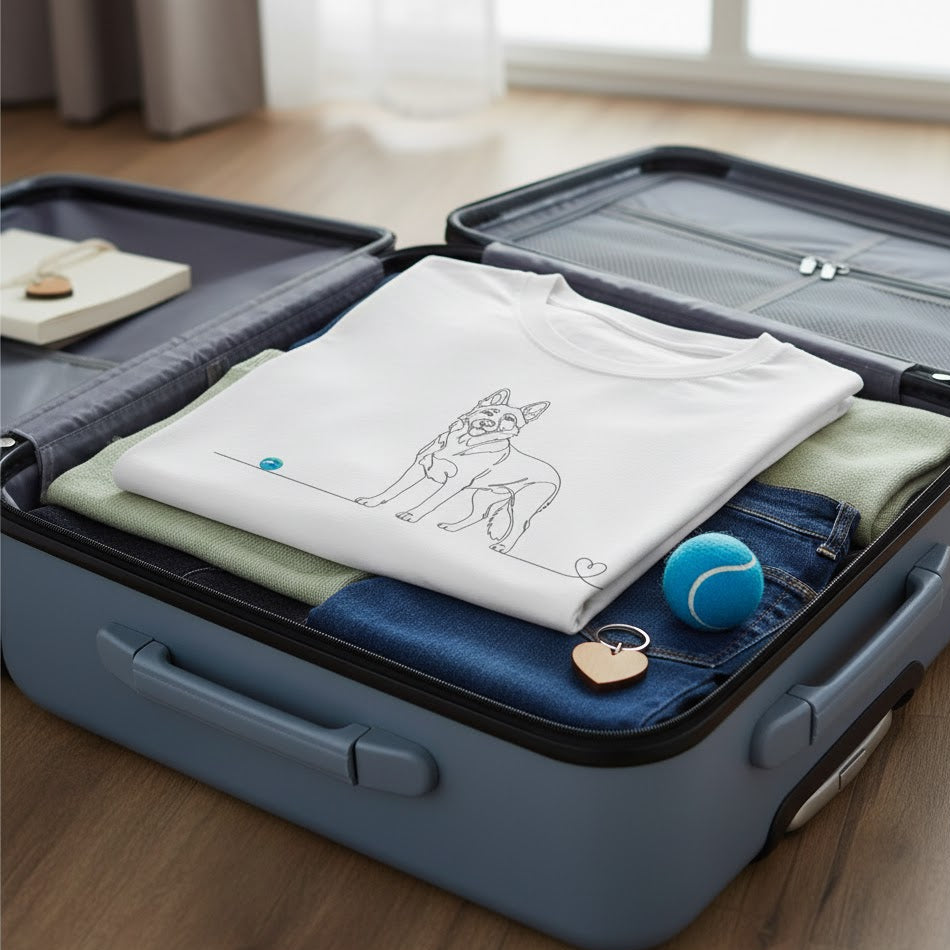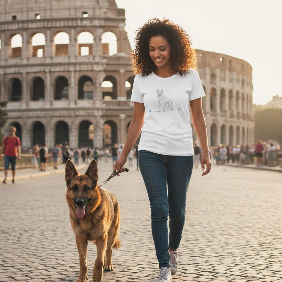 Esprimi il legame profondo con il tuo fedele compagno attraverso un design unico e minimalista. Questa T-shirt in edizione limitata presenta un'esclusiva Line Art di un Pastore Tedesco: un unico tratto continuo che disegna la silhouette fiera del cane per concludersi in un delicato cuore finale. Non è solo un capo d'abbigliamento, è un simbolo di amore incondizionato.