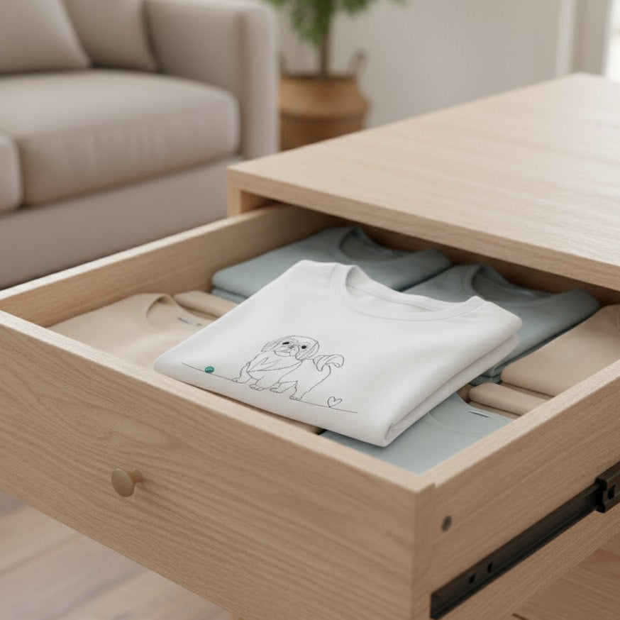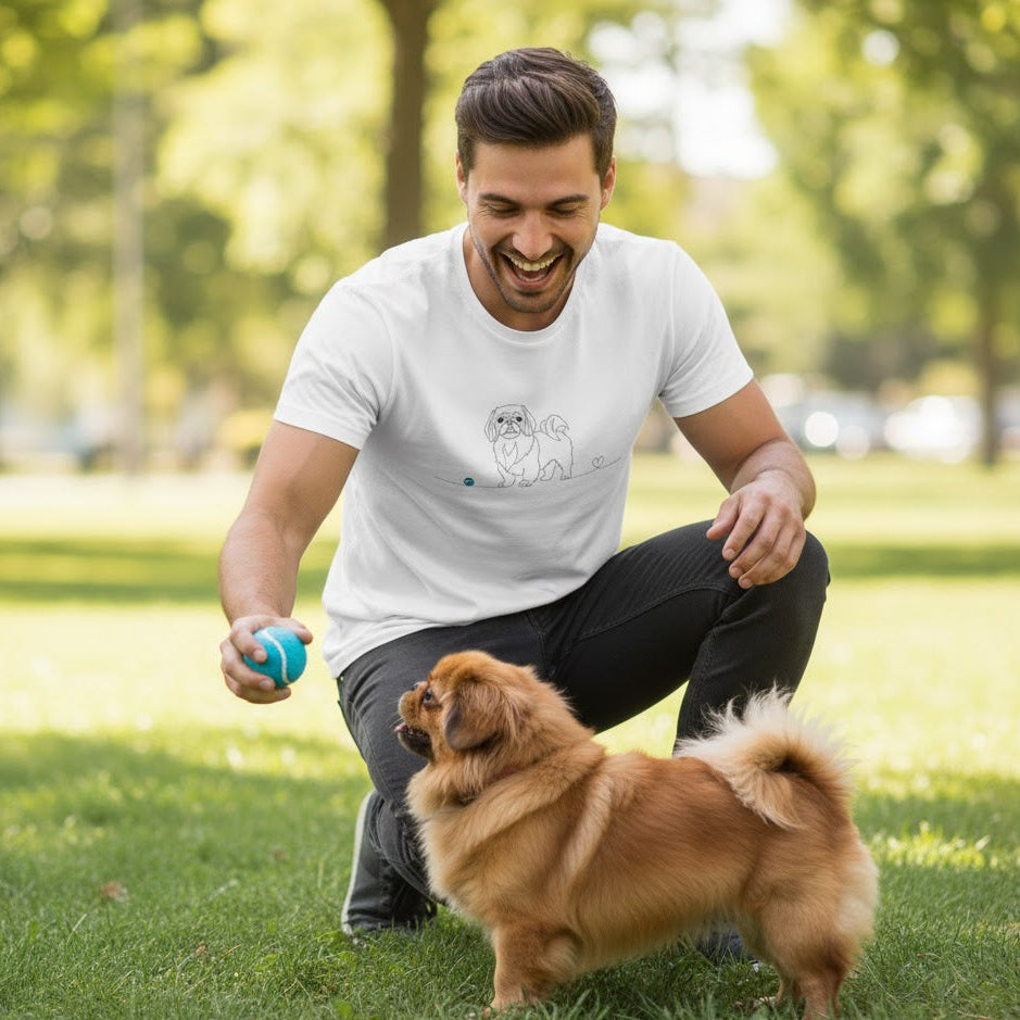 Sottile, raffinata e profondamente simbolica: la nostra T-shirt con disegno Line Art celebra il legame indissolubile con il tuo Pechinese. Una linea continua delinea il profilo fiero di questa nobile razza, concludendosi in un piccolo cuore finale, simbolo di un amore che non ha bisogno di troppe parole.