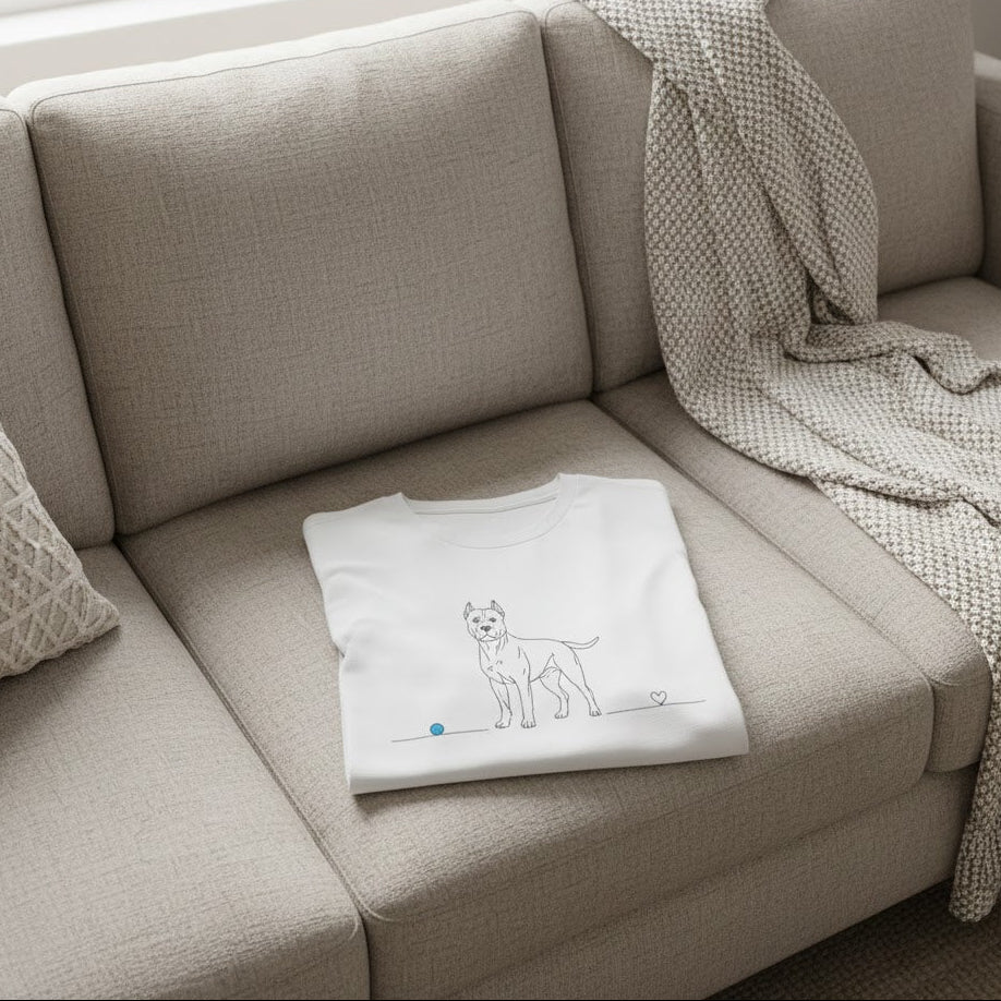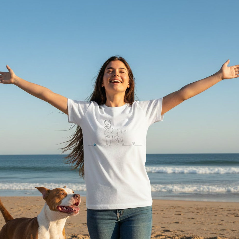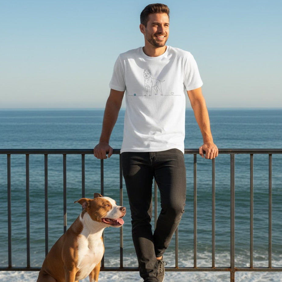 Esprimi la tua passione per il Pitbull con una t-shirt che unisce uno stile contemporaneo a un messaggio profondo. Il design Line Art cattura la fisionomia fiera e la dolcezza dello sguardo di questa razza straordinaria in un unico tratto continuo, che termina in un piccolo cuore. È il capo perfetto per chi vuole mostrare al mondo il legame speciale con il proprio amico a quattro zampe, senza rinunciare alla raffinatezza.