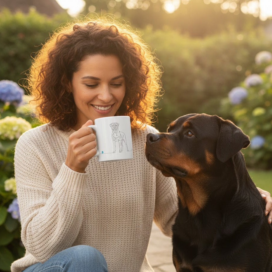 Inizia la giornata con il muso che ami di più. La nostra esclusiva tazza in ceramica celebra la forza e la dolcezza del Rottweiler attraverso un design in line art moderno e sofisticato. Un unico tratto nero, fluido e continuo, delinea il profilo fiero del Rottweiler per chiudersi in un cuore: il simbolo perfetto dell’amore incondizionato che solo questo cane sa donare.