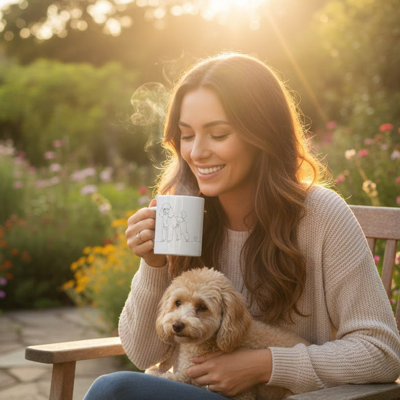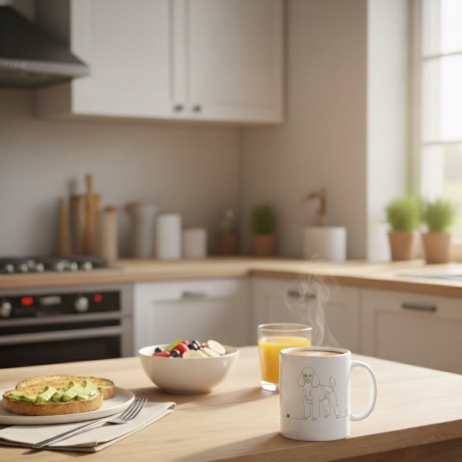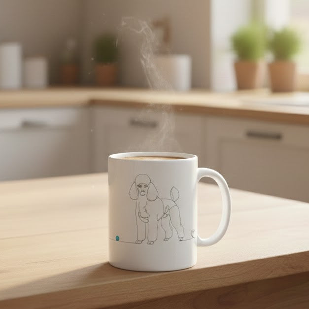 Immagina di iniziare ogni mattina con un sorriso. Mentre sorseggi il tuo caffè o il tuo tè preferito, la sagoma elegante e fedele del tuo Barboncino ti accompagna in un disegno line art essenziale e raffinato. Una linea continua che non solo delinea i tratti del tuo amico più caro, ma si trasforma in un cuore: il simbolo di un legame che va oltre le parole.