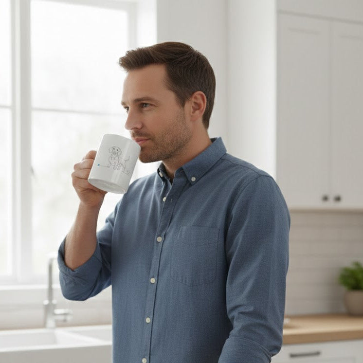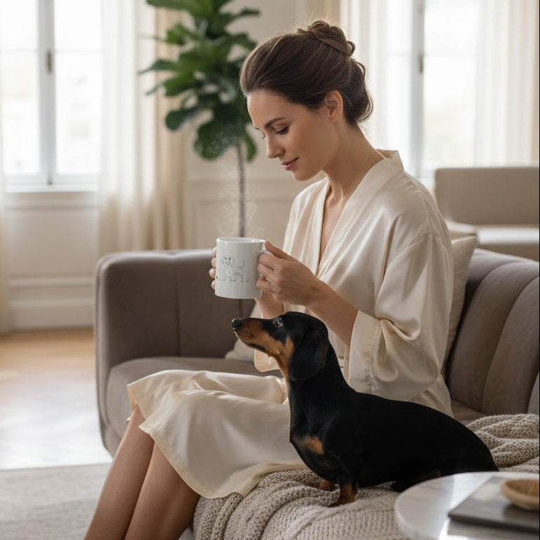 Trasforma il momento del caffè o del tè in un'esperienza ricca di stile. La nostra Mug non è solo un contenitore, ma un oggetto di design minimalista. Caratterizzata da una raffinata line art, la tazza mostra il profilo elegante del bassotto che si unisce armoniosamente a un cuore, celebrando la fedeltà e l'affetto del tuo amico a quattro zampe.