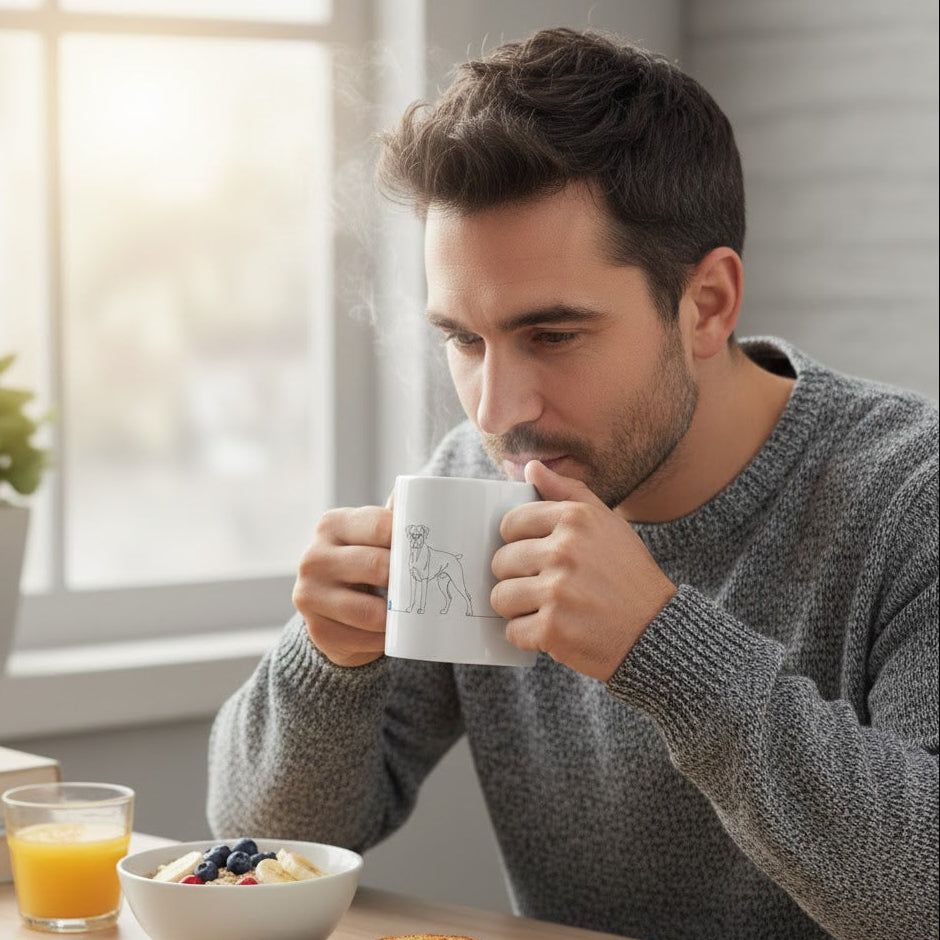 Il buongiorno ha tutto un altro ritmo insieme al tuo Boxer. C'è qualcosa di magico nel silenzio del mattino, quando stringi tra le mani una tazza calda e il tuo compagno a quattro zampe è lì, pronto a travolgerti con la sua gioia vitale. Questa tazza non è un semplice oggetto, ma un omaggio quotidiano all'energia e alla nobiltà del Boxer.