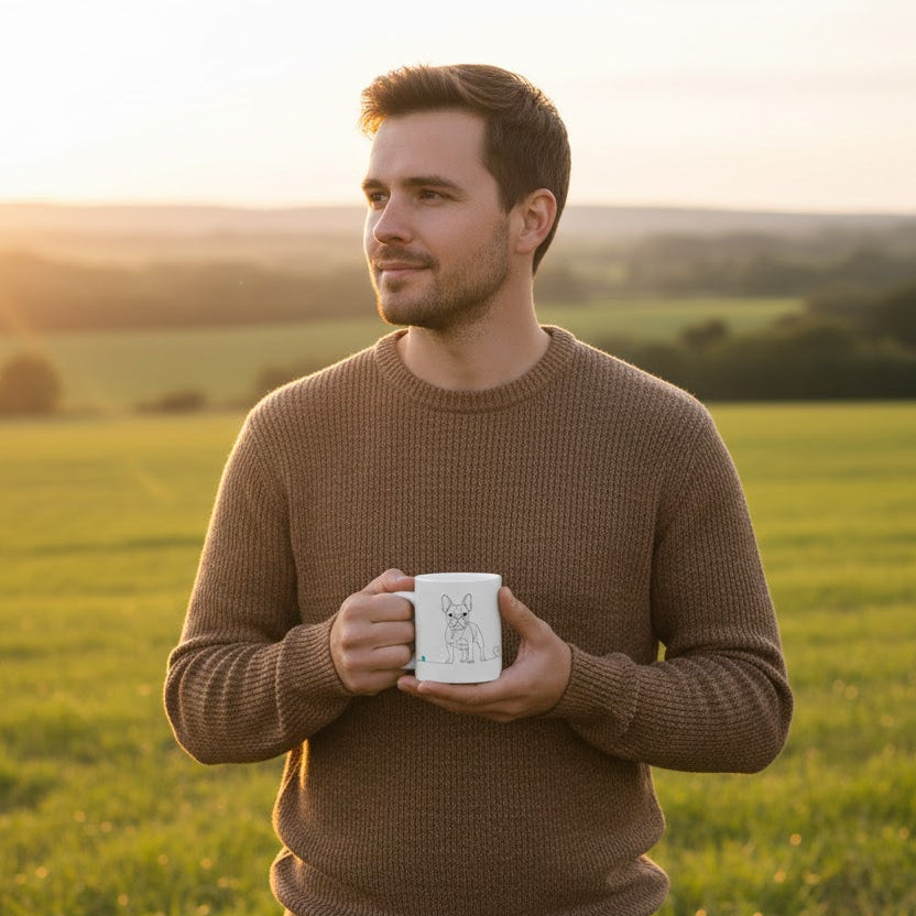 C'è qualcosa di magico nel primo caffè del mattino, specialmente se gustato in una tazza che parla delle tue passioni. La nostra Mug esclusiva celebra il legame speciale con il tuo amico a quattro zampe attraverso un design Line Art raffinato: un tratto nero, essenziale e moderno che disegna il profilo del Bulldog Francese che si intreccia armoniosamente con un piccolo cuore.