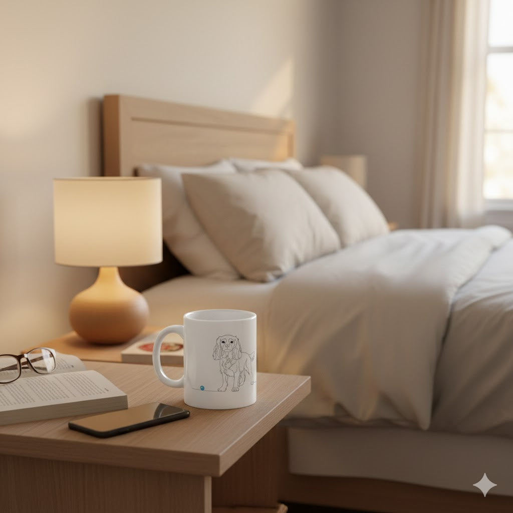 Inizia la tua giornata con la dolcezza inconfondibile del tuo amico a quattro zampe. Questa tazza in ceramica di alta qualità non è un semplice contenitore, ma un pezzo di design unico. Il decoro in line art cattura il profilo elegante del Cavalier King Charles in un unico tratto continuo, che si scioglie in un tenero cuore finale.
