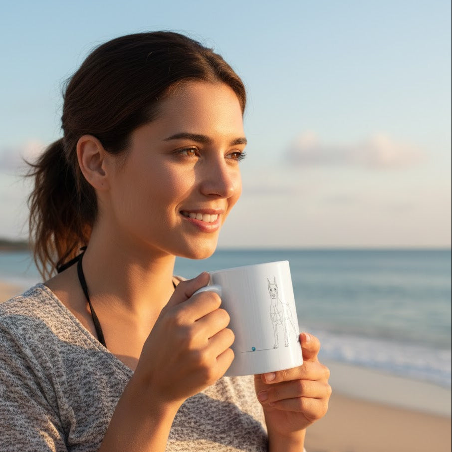 Non c’è niente di meglio che sorseggiare il caffè o il tè mattutino ammirando il profilo inconfondibile del tuo compagno a quattro zampe. Questa tazza in ceramica bianca sfoggia un raffinato design Line Art: una linea essenziale che disegna la sagoma nobile del Dobermann e si conclude con un cuore, simbolo di un legame che dura per sempre. Un accessorio minimalista che aggiunge un tocco di classe alla tua cucina o alla tua scrivania in ufficio.