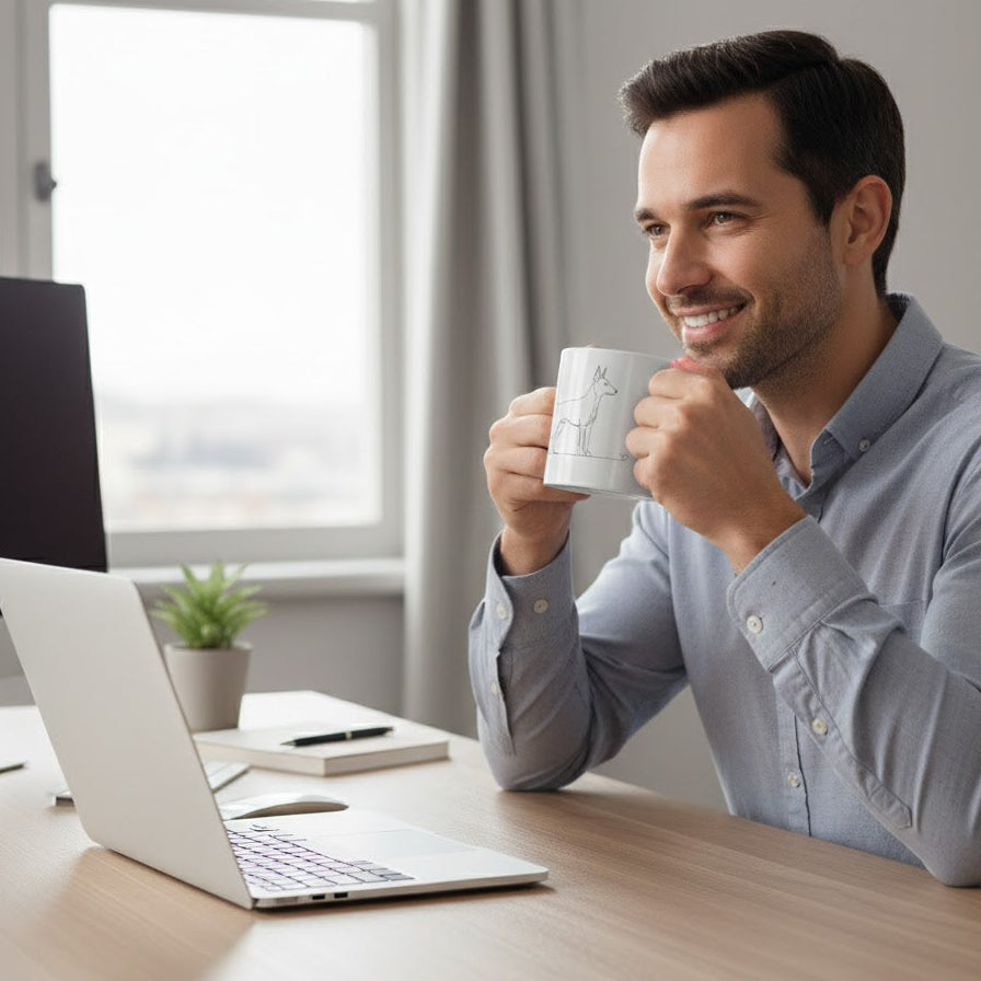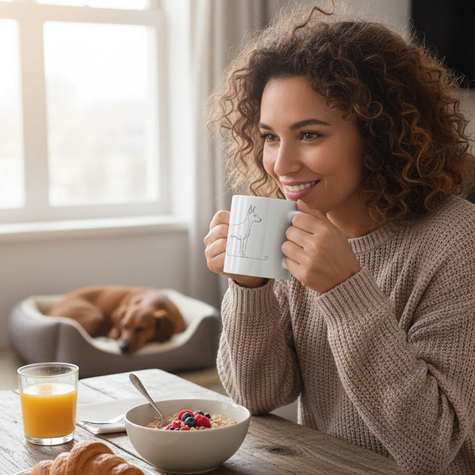 C’è qualcosa di magico nel primo caffè del mattino, specialmente se gustato in una tazza che parla di te e del tuo fedele compagno. Questa tazza bianca in ceramica, caratterizzata da un design esclusivo in line art, cattura la silhouette scattante e fiera del Pinscher con un tratto continuo che si scioglie in un piccolo cuore finale. Un accessorio indispensabile per ogni "dog lover" che apprezza lo stile minimalista e moderno.